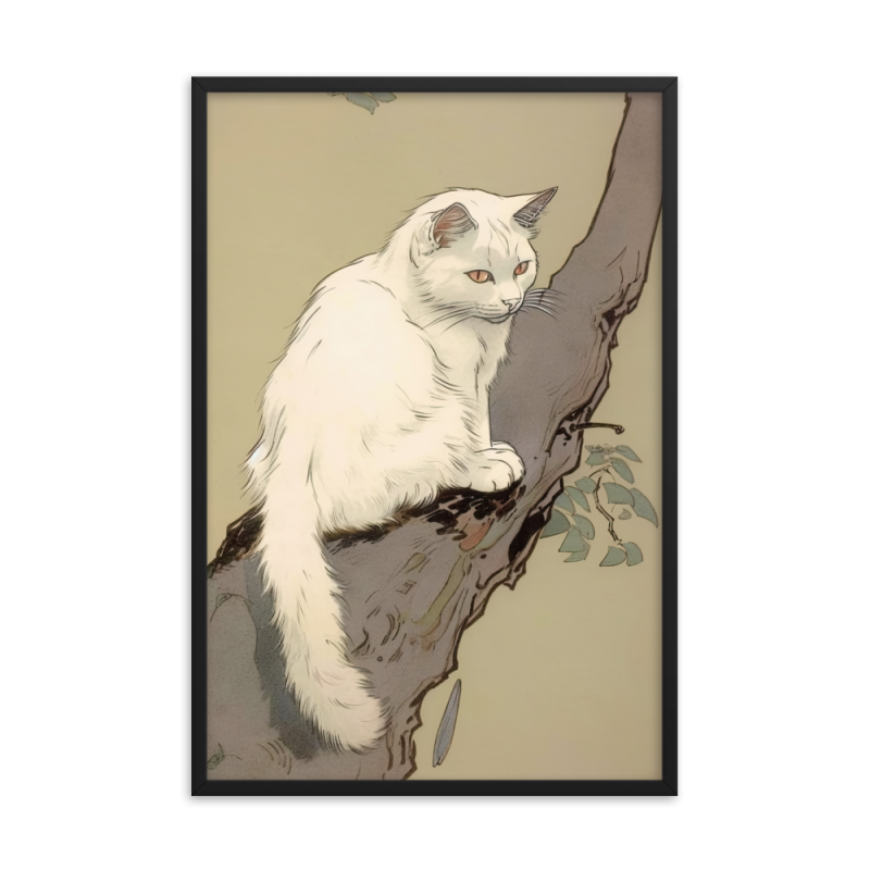 Bring a touch of elegance and tranquility to your home with this beautiful white cat sitting on a branch, captured in delicate Japanese fine line drawing style.
