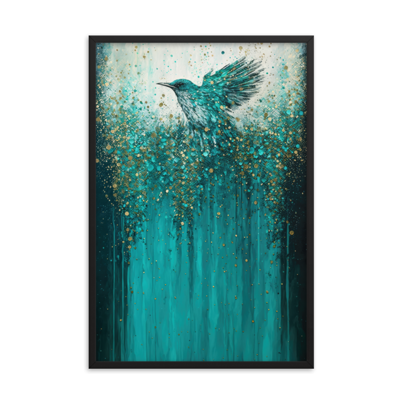The Azure Wing is a statement piece that will elevate any space; showcasing the teal bird about to take flight against a background of dripping teal paint, with stunning gold paint splatters accentuating the artwork beautifully.