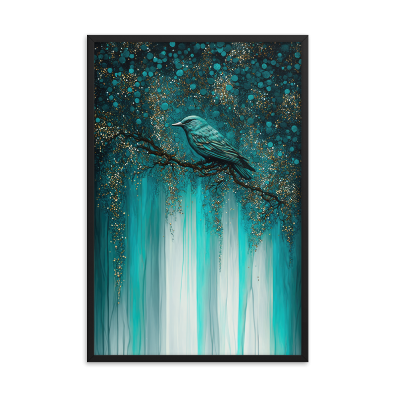 A stunning digital painting that captures the beauty and grace of a teal bird perched on a tree branch. The painting features vibrant shades of teal and gold, with a backdrop of dripping paint that adds an abstract touch to the piece.