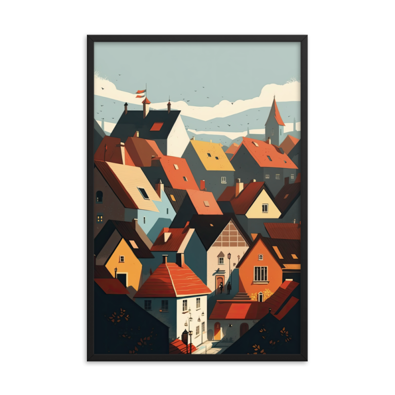 Transport yourself to the charming streets of Scandinavia with this beautiful illustration. The town's buildings feature bright orange triangular roofs that add a pop of color against the sky.