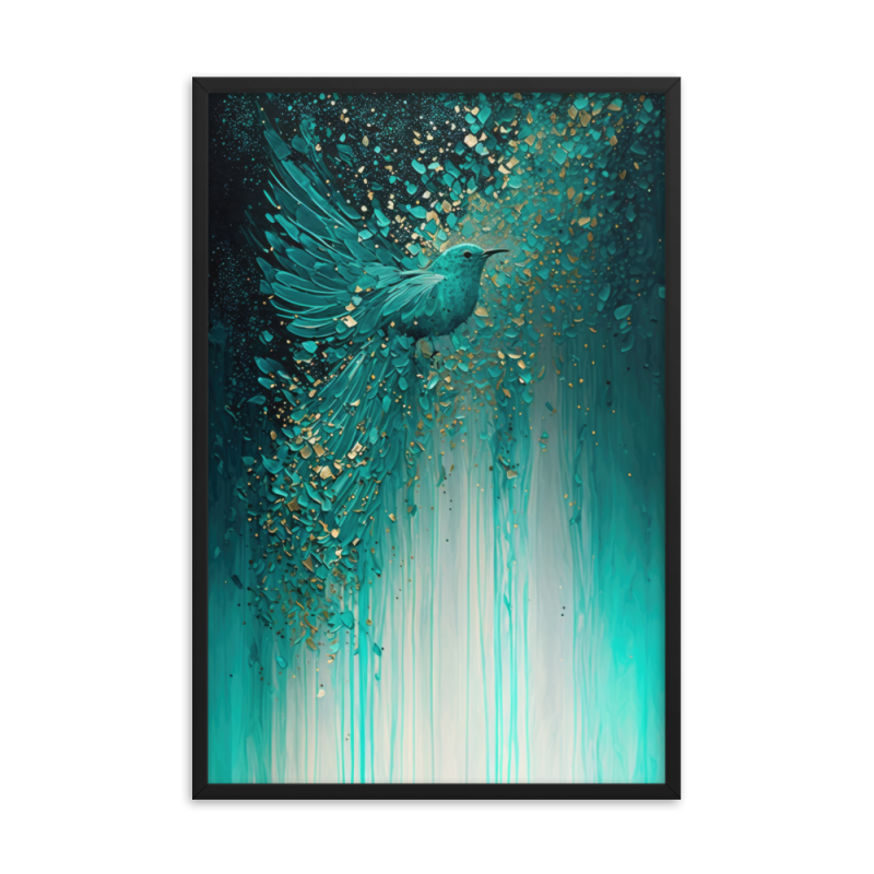 This artwork captures the essence of a teal bird with its wings outstretched in flight, set against a stunning background of dripping teal paint and flecks of gold. This artwork is perfect for those who appreciate the beauty of nature and unique art pieces.