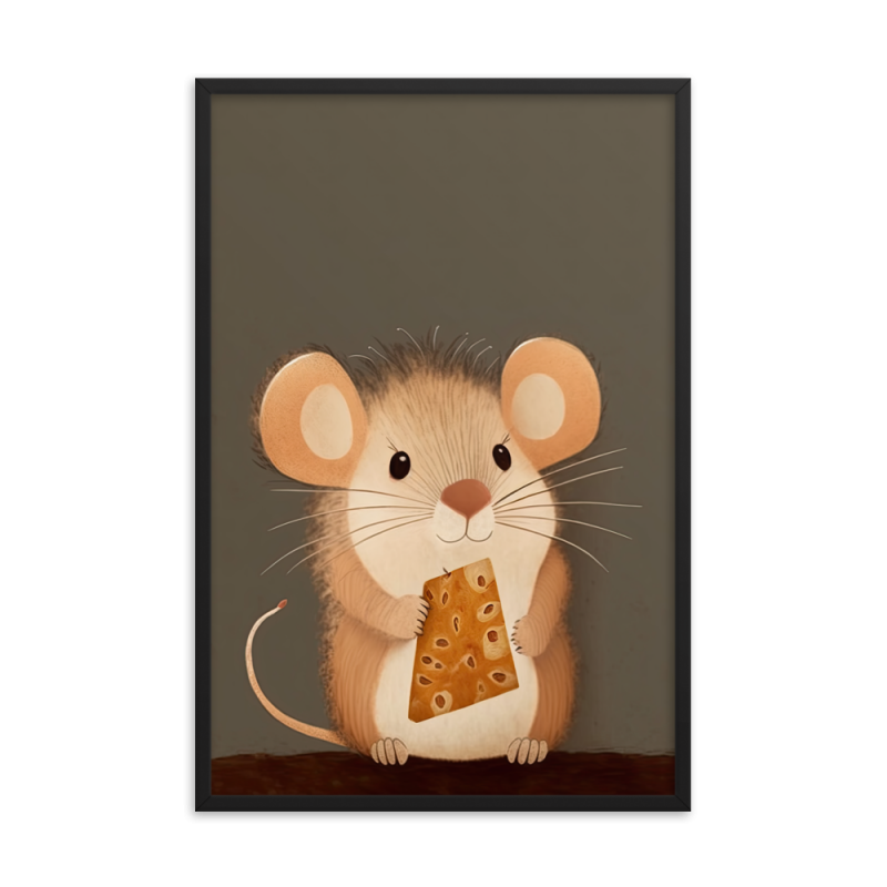 This adorable artwork features a cute, cartoony brown mouse standing on its hind legs, proudly holding a delectable piece of cheese. Bursting with joy and playfulness, this illustration will bring a smile to your face every time you see it.