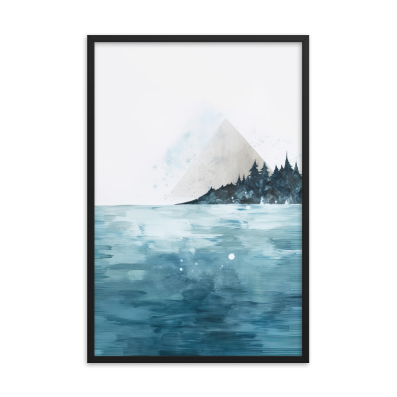 The deep blues of the ocean and shoreline, combined with the beige tones of the mountain, create a mesmerizing and captivating artwork that will transport you to a peaceful and serene place.