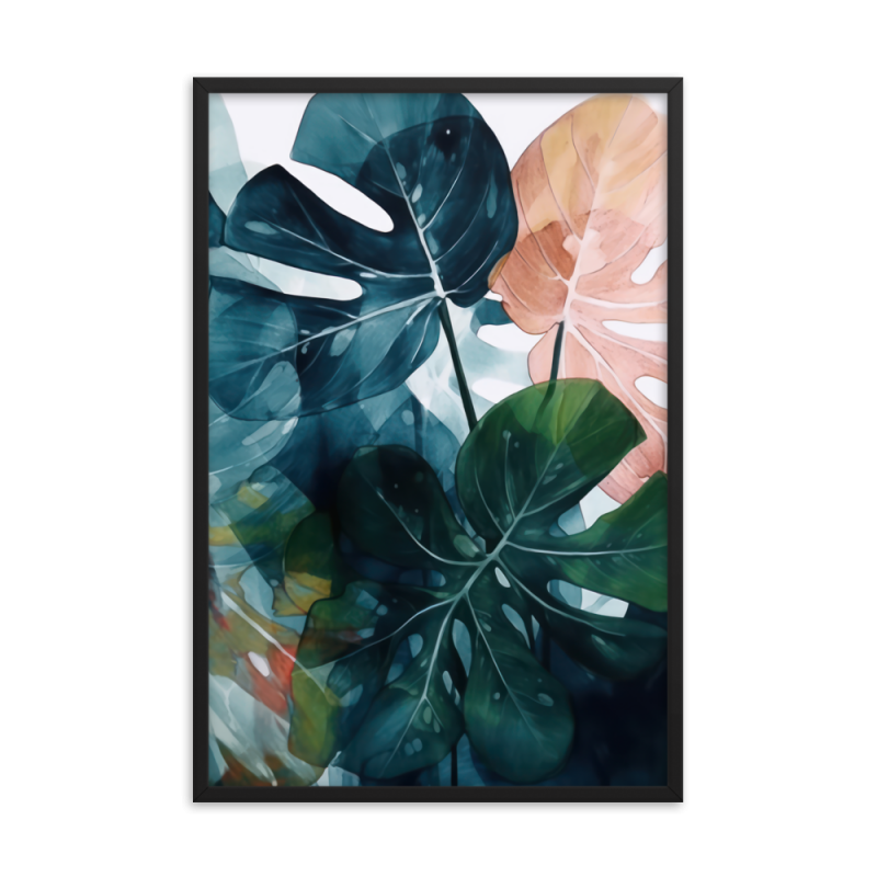 This captivating artwork features a watercolor painting of palm leaves in shades of navy, dark green, and blush. The graceful arrangement of these botanical elements evokes a sense of tropical serenity and sophistication.