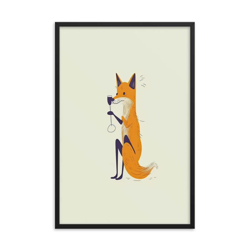 A delightful flat illustration of a fox crouching on the ground and drinking red wine from a wine glass. The fox looks a little innocent, making this artwork even more charming.